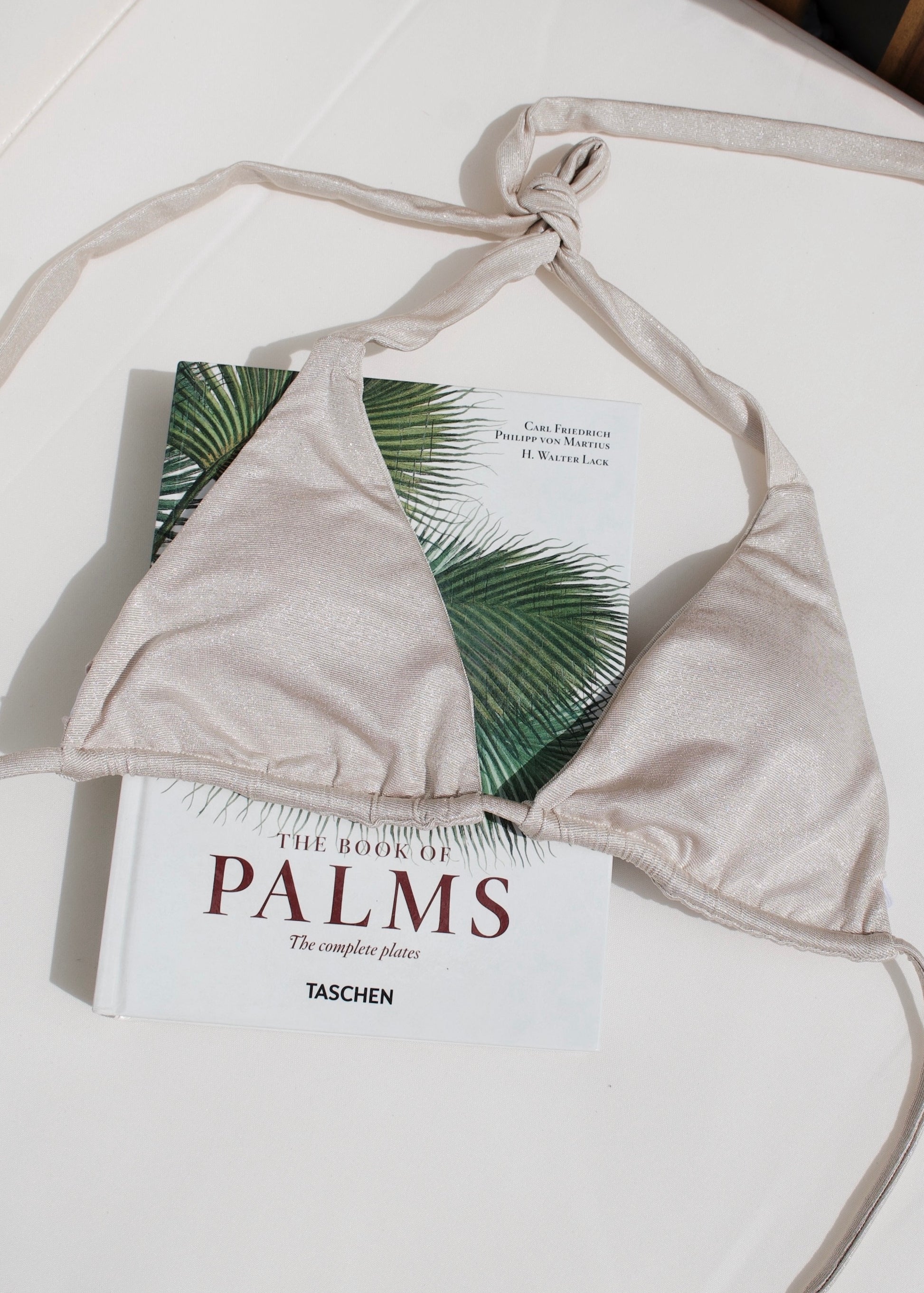 FourteenFour's Maya top in Champagne Shimmer is a classic triangle bikini top constructed of an eco-friendly recycled fabric with an eye - catching shimmer effect.